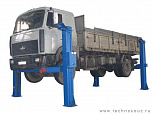 г/п. 10 тонн. Четырехстоечный. Электромеханический. Для ремонта грузовых автомобилей отечественного и импортного производства и автобусов на любой ровной площадке. Привод червячный редуктор, с концевыми выключателями нажимного действия, ограничивающими ход каретки. По отдельному заказу комплектуется установочными рамами. Поставляется в 2 вариантах Стандарт (в помещение) и ТЗ (Для эксплуатации на улице).