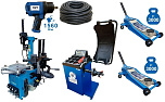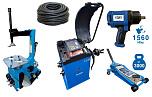 Комплект: шиномонтажный станок TS-21 для дисков: внешний 11÷20” + пистолет с манометром для подкачки шин + монтажка + пластиковые накладки на зажимные кулачки + регулятор давления с влагоотделителем и манометром. + TS-500 балансировочный станок с автозапуском, для колес легковых автомобилей и легких грузовиков, диаметр диска с резиной до 760 мм. размеры диска: ширина 3"–9” (76-228 мм), диаметр диска  10"–21” (254-533 мм). + кожух защитный + клещи + кронциркуль + быстрозажимная гайка + набор конусов + подкатной домкрат г/п 3,0т. 130-465мм. + ударный пневмогайковерт 1/2" крутящий момент 745Нм +  шланг кислородный 9мм 20Атм. 10м