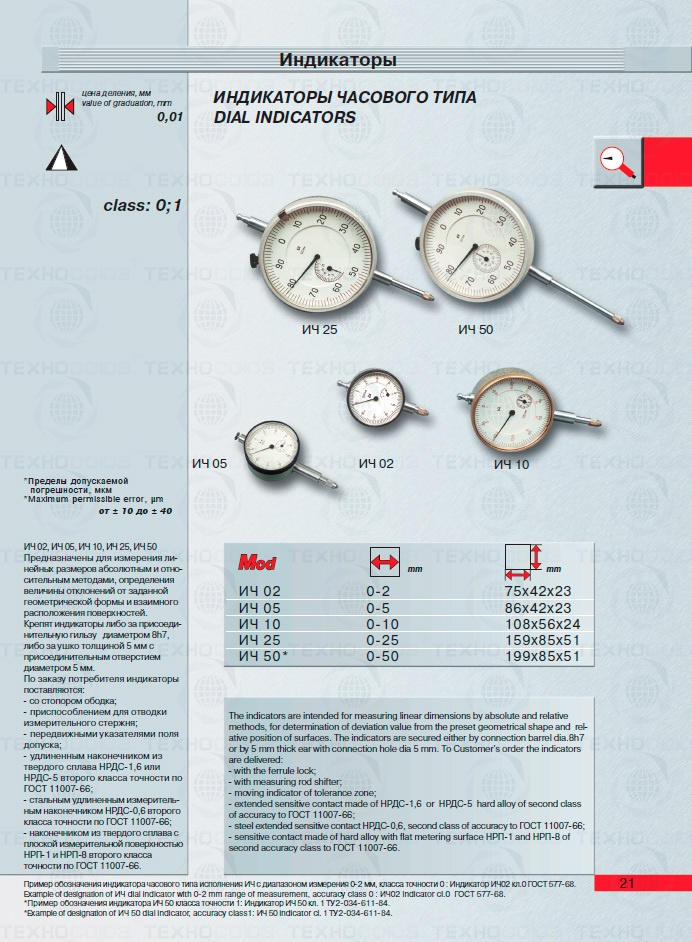Индикаторы часового типа с ценой деления 0,01 мм. Диапазон измерения от 0-10 мм. Предназначены для абсолютных и относительных измерений линейных размеров, определения величины отклонений от заданной геометрической формы и взаимного расположения поверхностей. Класс точности 1. ГОСТ 577-68. Поставляется в двух вариантах с поверкой и без поверки!