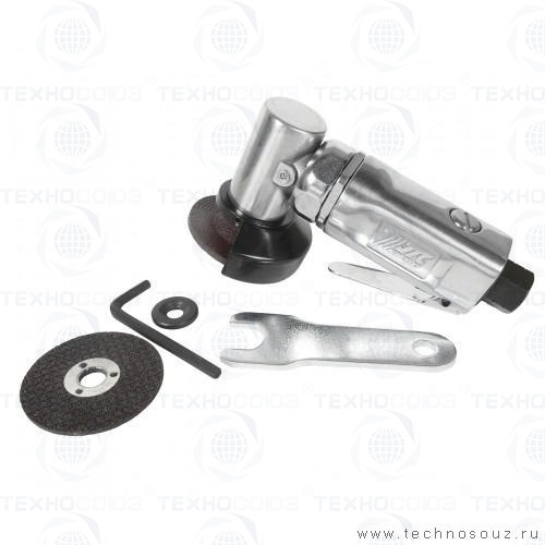 Пневмоболгарка снабжена защитным металлическим кожухом для предотвращения травм персонала во время работы.