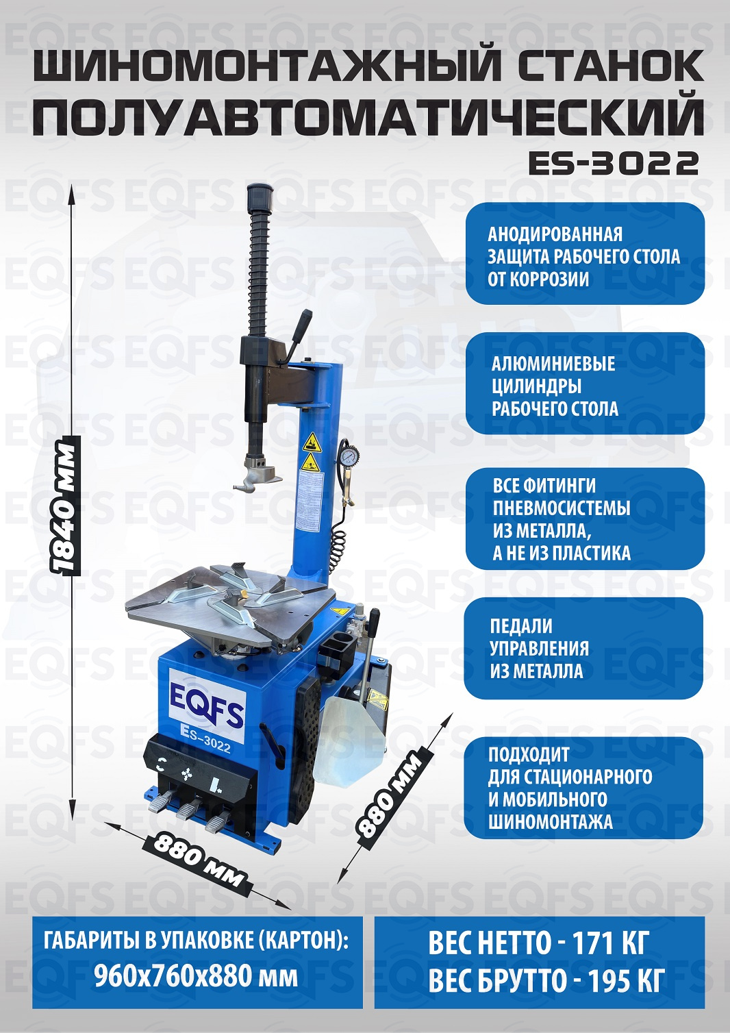 Полуавтоматического шиномонтажного станка ES-3022 предназначен для монтажа и демонтажа колес легковых автомобилей, легких грузовиков, не больших автобусов и коммерческой техники. Для дисков: 11÷24”. В комплекте: пистолет для подкачки шин + монтажка + регулятор давления с влагоотделителем и манометром.