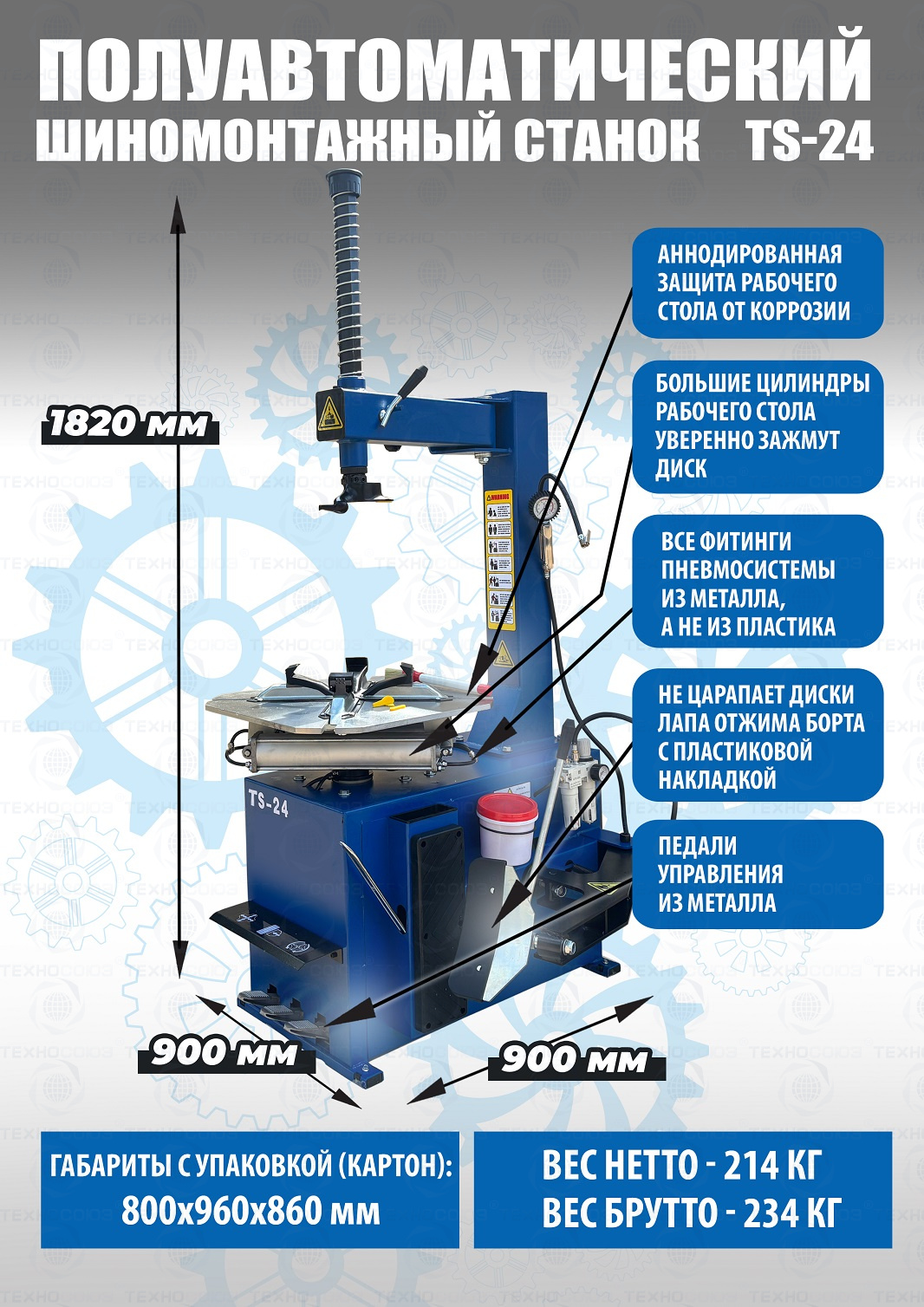 TS-24 Станок шиномонтажный. Полуавтоматический. Квадратный стол. Для дисков: внешний 11÷21”, внутренний 12÷24”. Усилие отрыва покрышки 2700 кг. В комплекте: пистолет для подкачки шин + монтажка + пластиковые накладки на зажимные кулачки + регулятор давления с влагоотделителем и манометром.