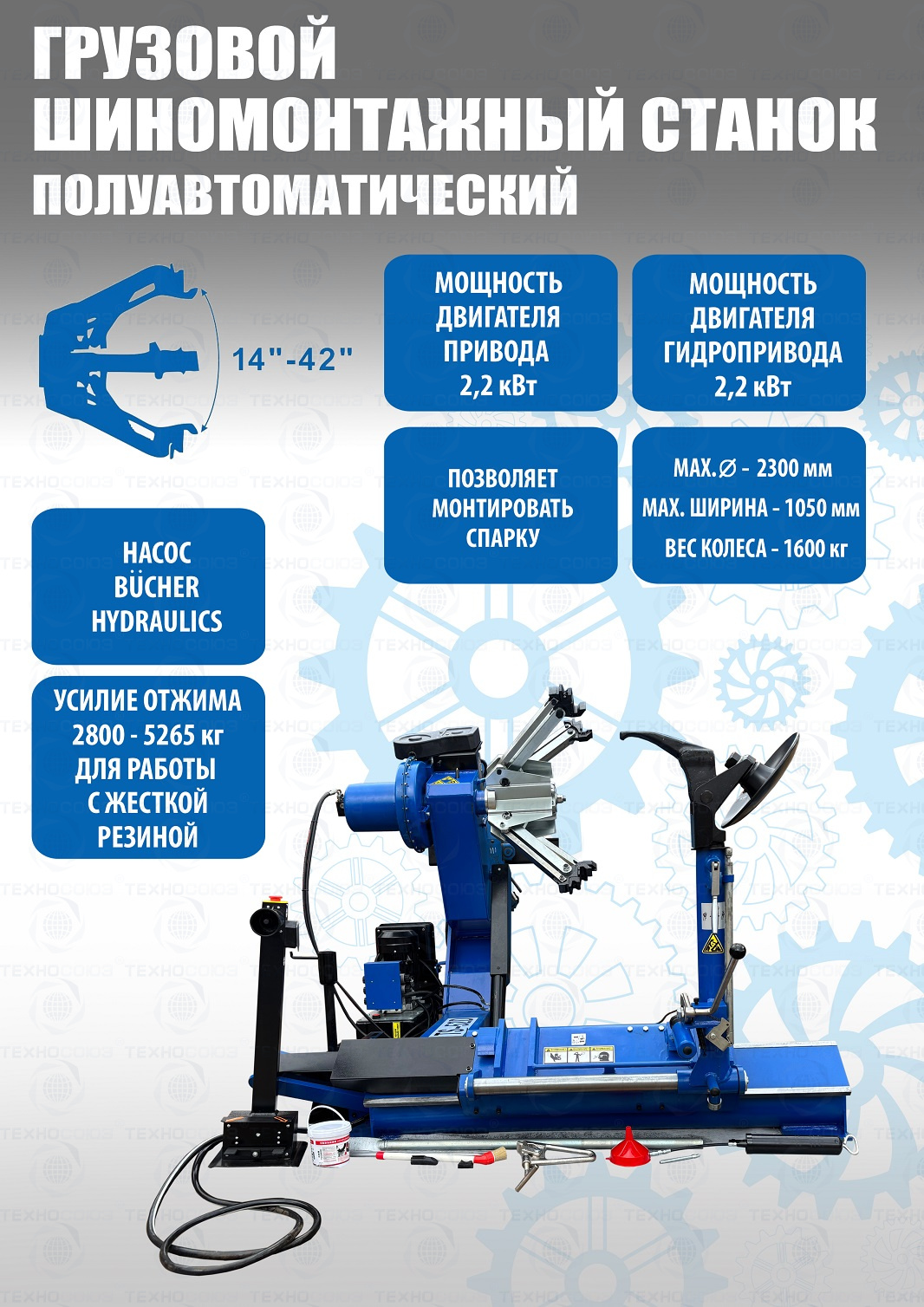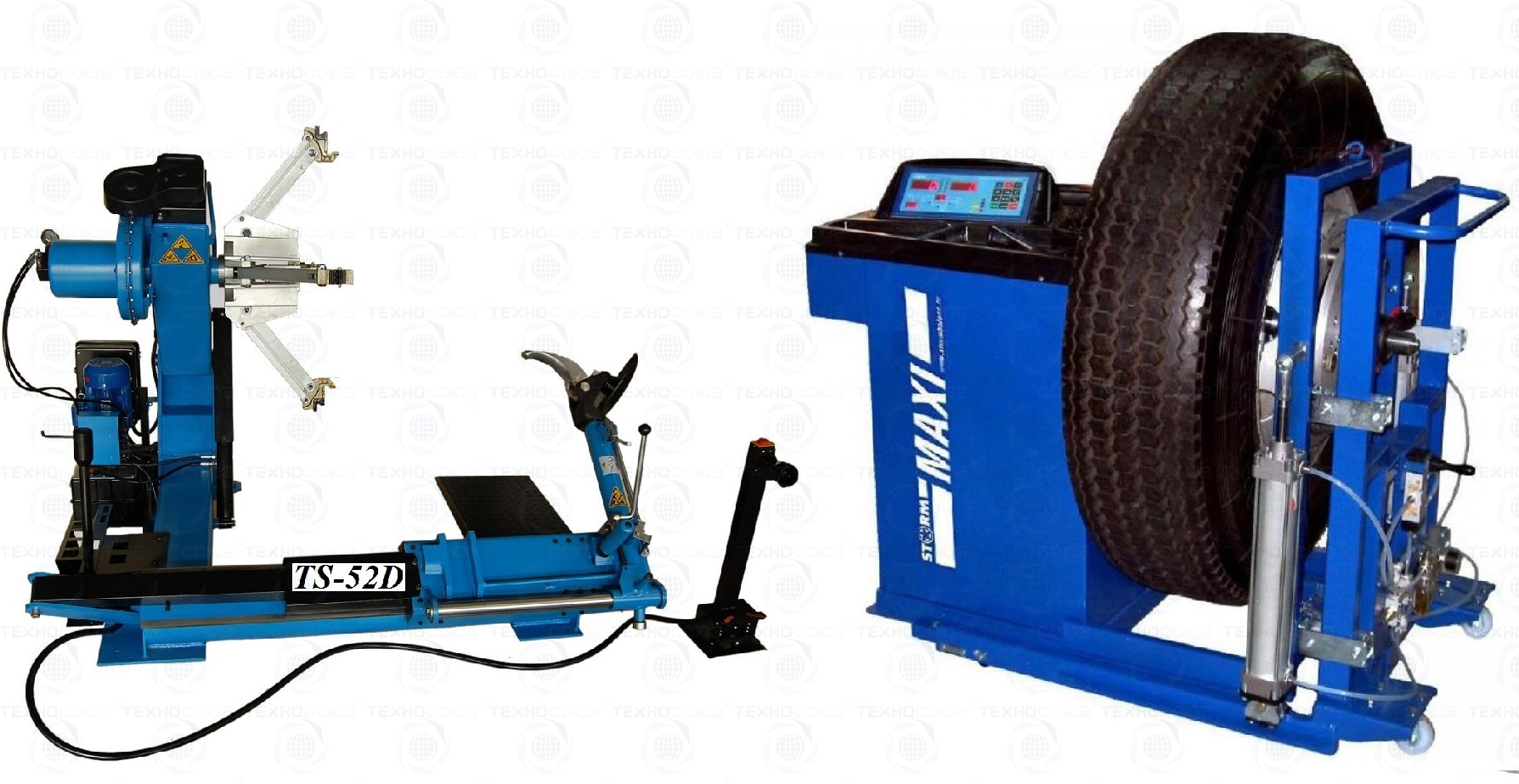 Комплект из TS-52D грузового шиномонтажного станка для дисков 14”-42”,  с удлинителями на захваты до 52” - очень качественный станок. За последние 9 лет ни одной рекламации!!!  Диски сталь + ALU Ø 14÷42” с адаптерами 14÷52”(опция). Автомат. Максимальное колесо Ø2300 ширина1050мм, вес до 1600кг. Моторы 2,2 + 2,2 кВт, 380В. Гарантия 12÷18мес. Гидронасос «BUCHER HIDRAULICS». Cтанок подходит для тракторов, сельхозтехники, еврофур и т.п. + ЛС-32 MAXY P Универсальный грузовой балансировочный станок для колес диаметром от 10 до 30 дюймов, имеет две программы для работы с легковыми и грузовыми колесами. Максимальный вес колеса до 200 кг. Оснащен функциями автокалибровки и самодиагностики.В стандартный комплект входит набор конусов для установки колес легковых автомобилей, микроавтобусов и легковых грузовиков типа "Газель", а также универсальный адаптер для установки колес большинства типов грузовых автомобилей. Для установки тяжелых колес ЛС 32 MAXIP комплектуется подкатной тележкой с пневматическим подъемным механизмом. Внесен в реестр средств измерений России Казахстана и Респ. Беларусь