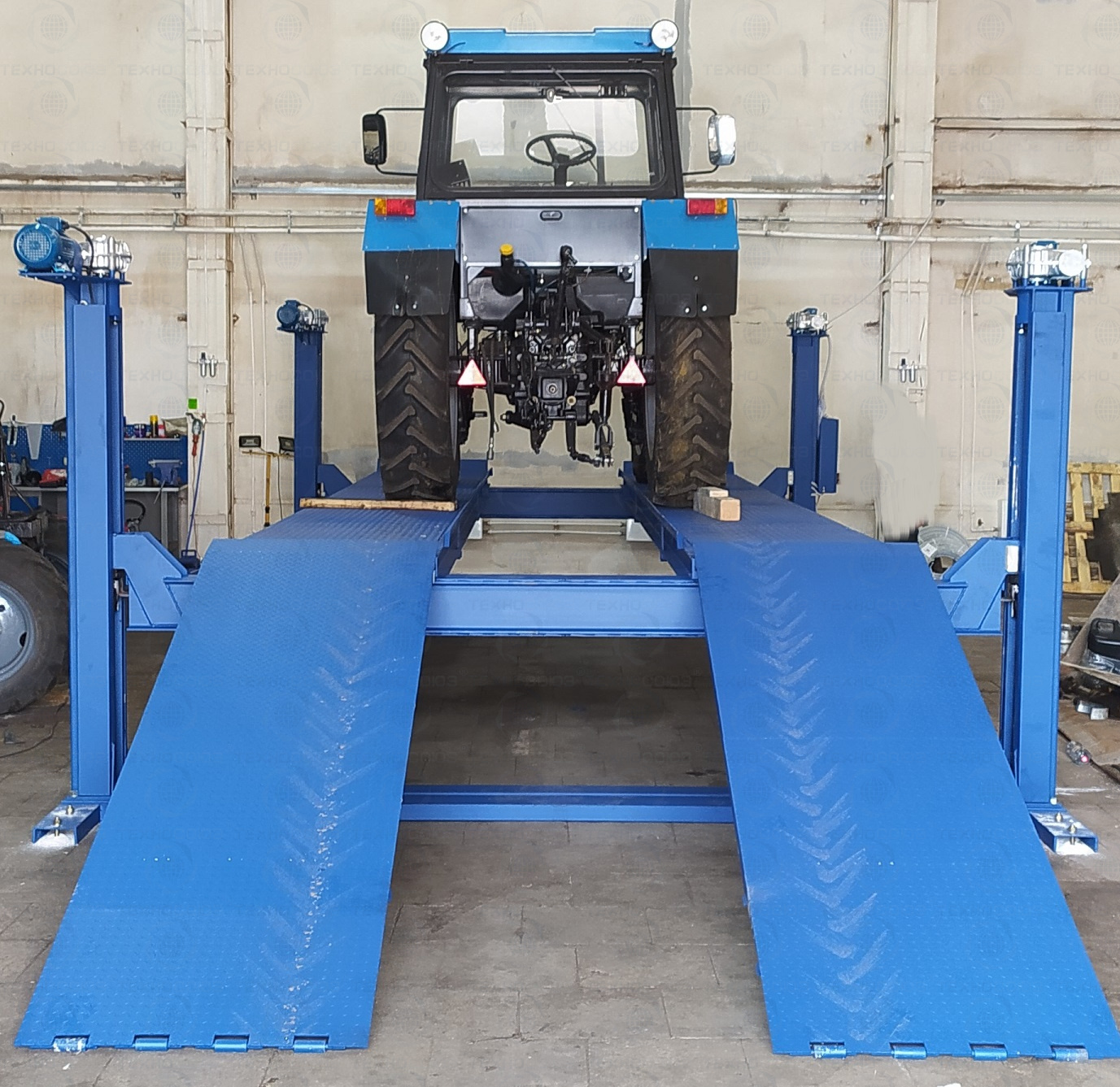 г/п. 20 тонн. Четырехстоечный. Электромеханический. Для ремонта грузовых автомобилей и автобусов на любой ровной площадке. Привод червячный редуктор, с концевыми выключателями нажимного действия, ограничивающими ход каретки. Рабочие гайки повышенной прочности и износостойкости. Многоуровневая система безопасности. По отдельному заказу комплектуется установочными рамами. Поставляется в 2 вариантах Стандарт (в помещение) и ТЗ (Для эксплуатации на улице).