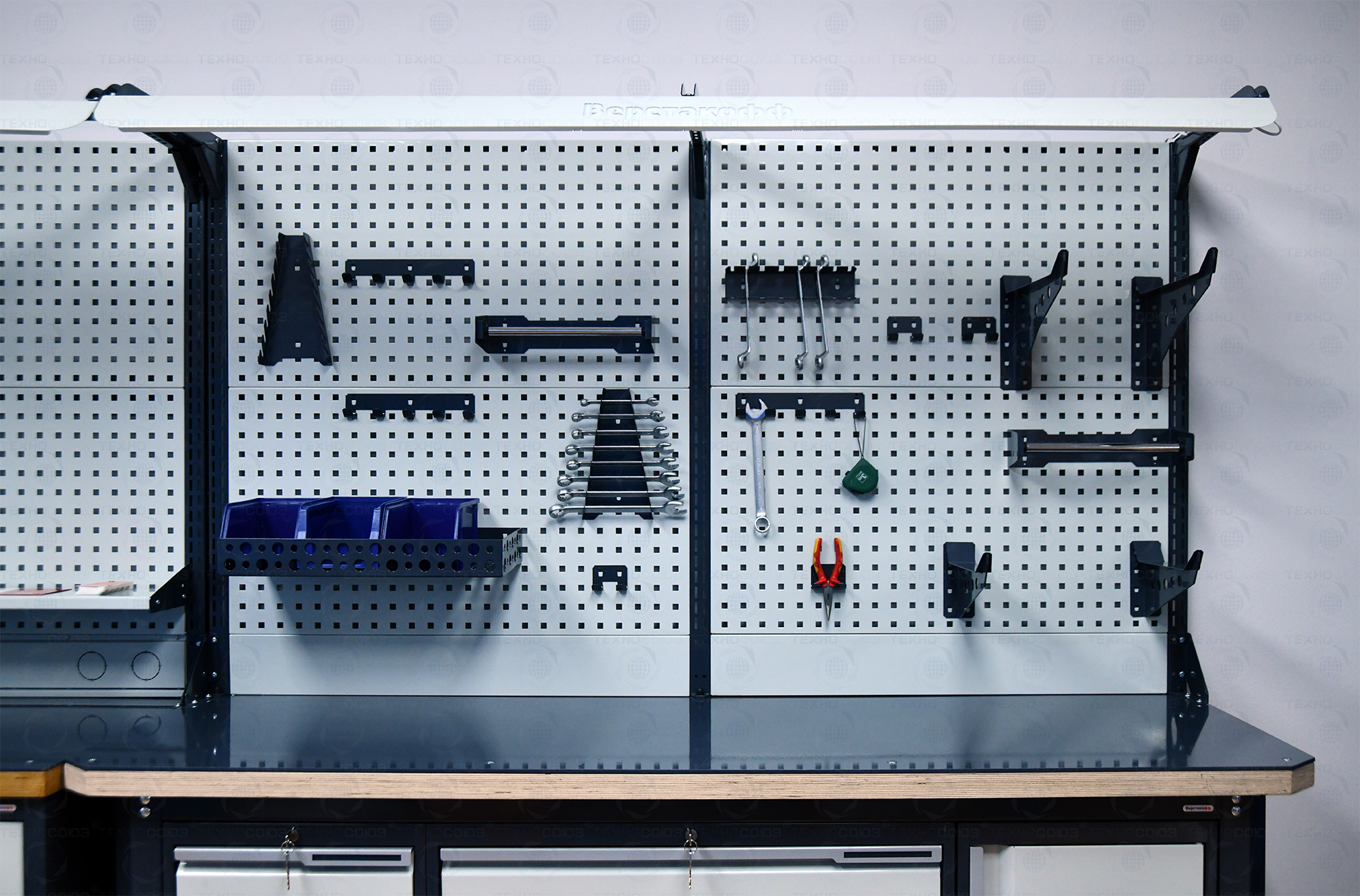 Экран (перфорированная панель) верстака выполнен с квадратной перфорацией 12х12 мм с шагом 38 мм для установки крючков, держателей и других аксессуаров. Экран крепятся к столешнице с помощью специальных кронштейнов. Максимальная масса груза, равномерно распределенного по поверхности экрана, составляет 71 кг.