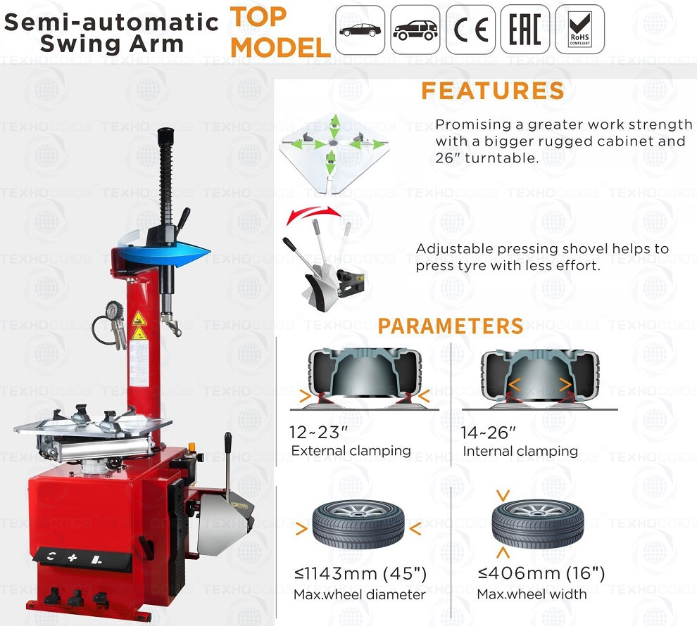 Для больших и широких колес. Станок шиномонтажный полуавтомат 12-26". Для шиномонтажных работ с колесами легковых автомобилей, Газелей и т.п. Внешний зажим 12-23”. Внутренний зажим 14-26”. 220В или 380В. Гарантия 18 мес – наш монтаж, 12 мес – самостоятельная установка.
